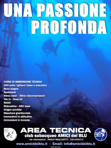 Nella sezione Area Tecnica trovi tutti i corsi avanzati che il Club Subacqueo Amici del Blu ha da proporti. Naviga tra le varie pagine di quest'area per scoprire tutti gli interessanti argomenti dei corsi tecnici. Se vuoi ulteriori informazioni non esitare a contattarci, ti risponderemo gratuitamente e senza alcun impegno! |